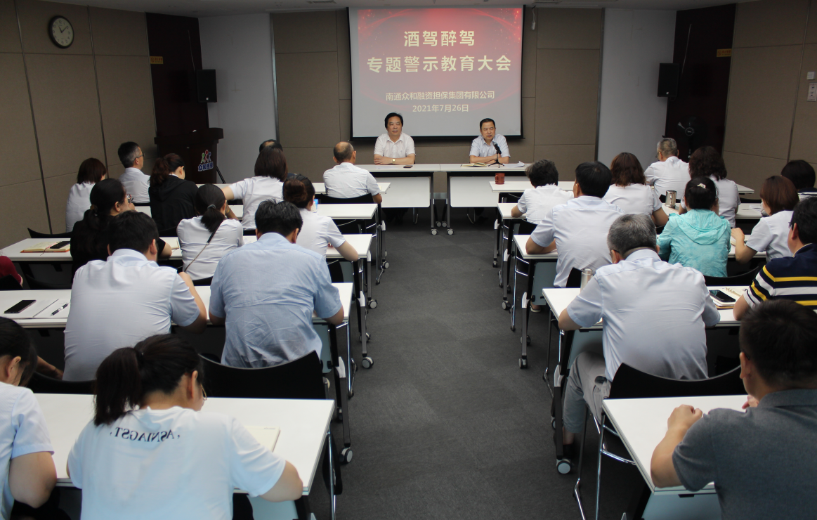 為深入貫徹落實(shí)產(chǎn)控集團(tuán)關(guān)于開展“酒駕醉駕專題警示教育”通知要求,進(jìn)一步強(qiáng)化酒后駕車警示教育,有效預(yù)防和堅(jiān)決遏制公司干部職工酒駕醉駕等違法違紀(jì)行為的發(fā)生,7月26日上午,南通眾和融資擔(dān)保集團(tuán)有限公司召開酒駕醉駕專題警示教育大會(huì),本部全體干部職工、子公司中層以上干部近60人參加會(huì)議,黨支部書記何葉主持會(huì)議。